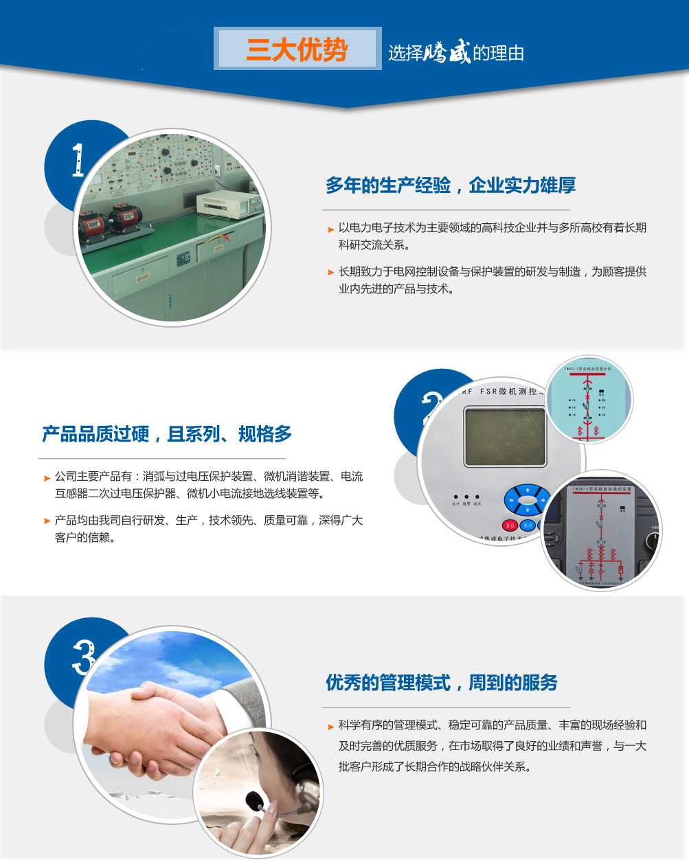 合肥騰威集成電子技術有限公司是一家以電力電子技術為主要領域的高科技企業,坐落于國家科技創新型城市合肥,與多所高校有著長期科研交流關系。   公司長期致力于電網控制設備與保護裝置的研發與制造,為顧客提供業內先進的產品與技術。公司主要產品有:消弧與過電壓保護裝置、微機消諧裝置、電流互感器二次過電壓保護器、微機小電流接地選線裝置、微機電壓綜合保護裝置(抑制柜/聚優柜控制器)、開關柜智能操控裝置、開關柜無線測溫裝置、電網運行設備在線絕緣監測裝置、可恢復式爆炸橋控制器、中性點接地電阻柜微機測控裝置等。以上產品均由我司自行研發、生產,質量可靠,深得廣大客戶的信賴。   公司憑借科學有序的管理模式、穩定可靠的產品質量、豐富的現場經驗和及時完善的服務,在市場取得了良好的業績和聲譽,與一大批客戶形成了長期合作的戰略伙...